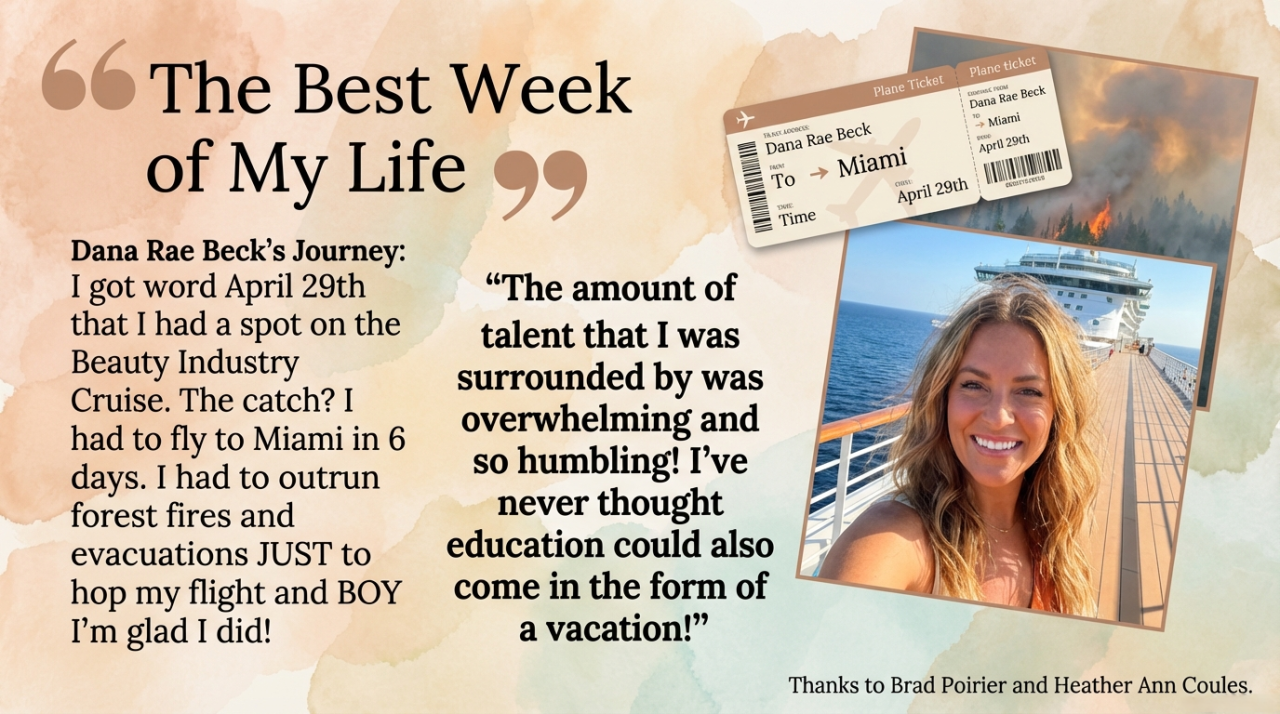 Get ready for a LONG post! I got word on April 29th 2023 that I, Dana Rae Beck had a spot on the Mayan Sol Beauty Industry Cruises 2023 cruise!! How super exciting right! The catch, I had to fly out to Miami in 6 days. That’s right 6 days! I’ve had to out run forest fires and evacuation after evacuation JUST to hop my flight and BOY I’m glad I did! This last week has been the best week of my life! The amount of talent that I was surrounded by was overwhelming and so humbling! I’ve never thought education could also come in the form of a vacation! Thank you to Brad Poirier for spearheading this whole thing, to Every single Educator, You where all so kind and open and a HUGE thank you to Heather Ann Coules You have given me the gift of a life time that I will never forget.