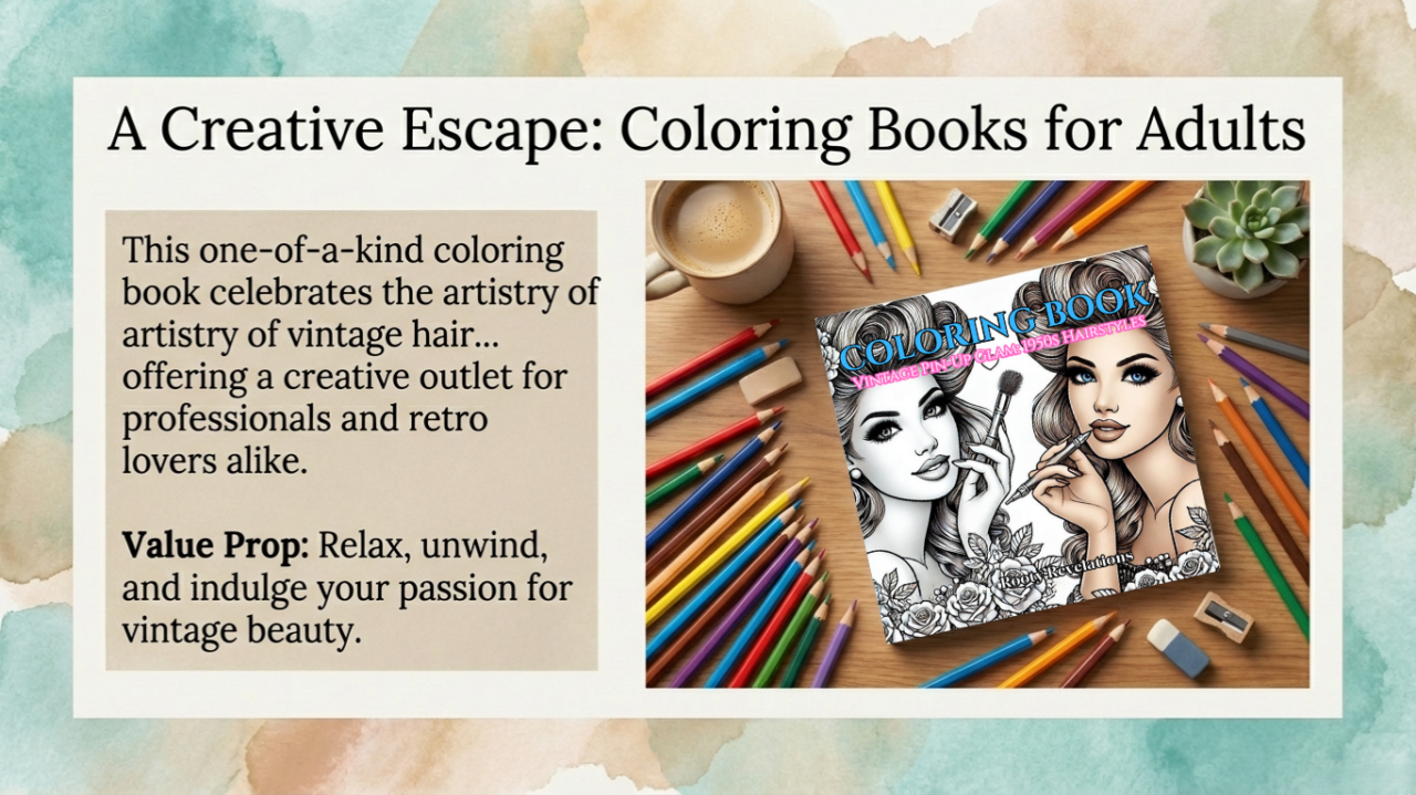 This one-of-a-kind coloring book celebrates the artistry of vintage hair, featuring intricately designed pages of classic pin-up hairstyles. Each illustration captures the elegance, flair, and bold confidence of 1950s fashion, offering a creative outlet for professionals and retro lovers alike.